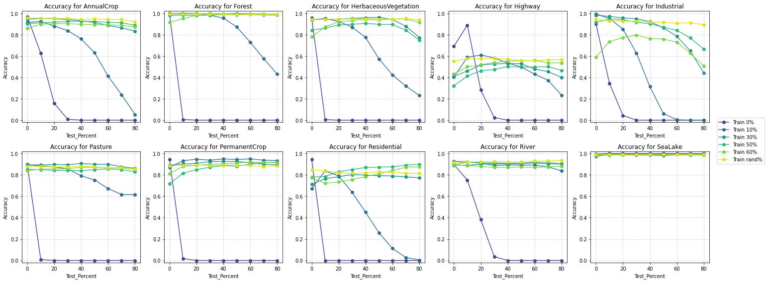 Highway Class: Both accuracy and F1 scores are consistently lower compared to other classes. Extreme outlier values (-9999) make it difficult for the model to accurately predict highways, which are narrow, linear features often surrounded by heterogeneous land types. The improvement is likely due to the continuity provided by reflectance-like values (0.6–1), which are closer to the spectral characteristics of concrete or asphalt.
