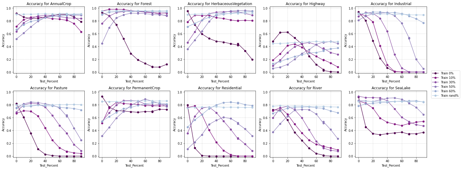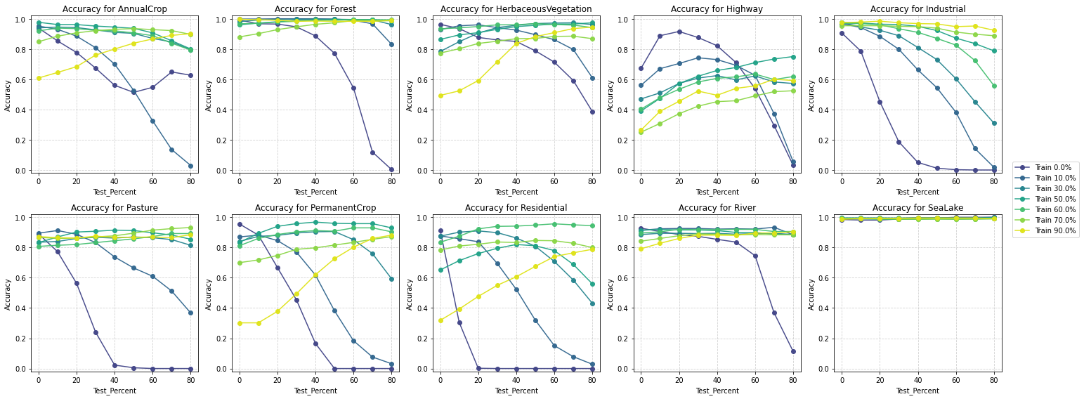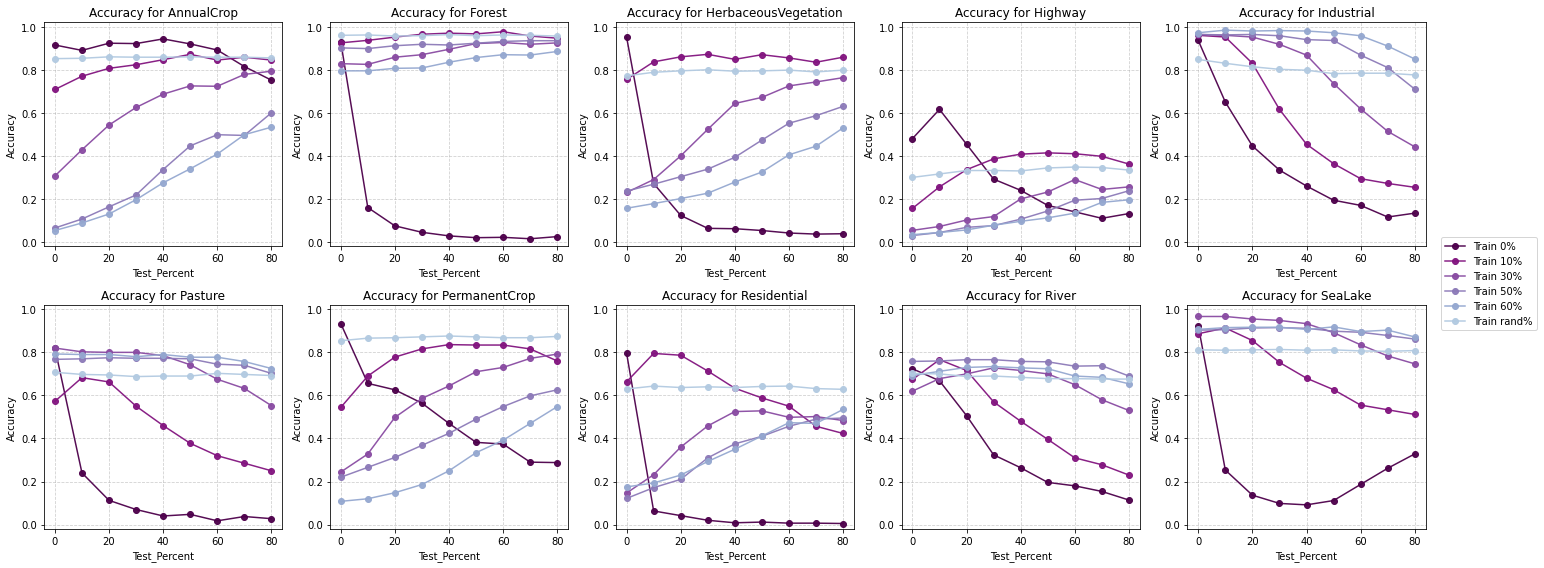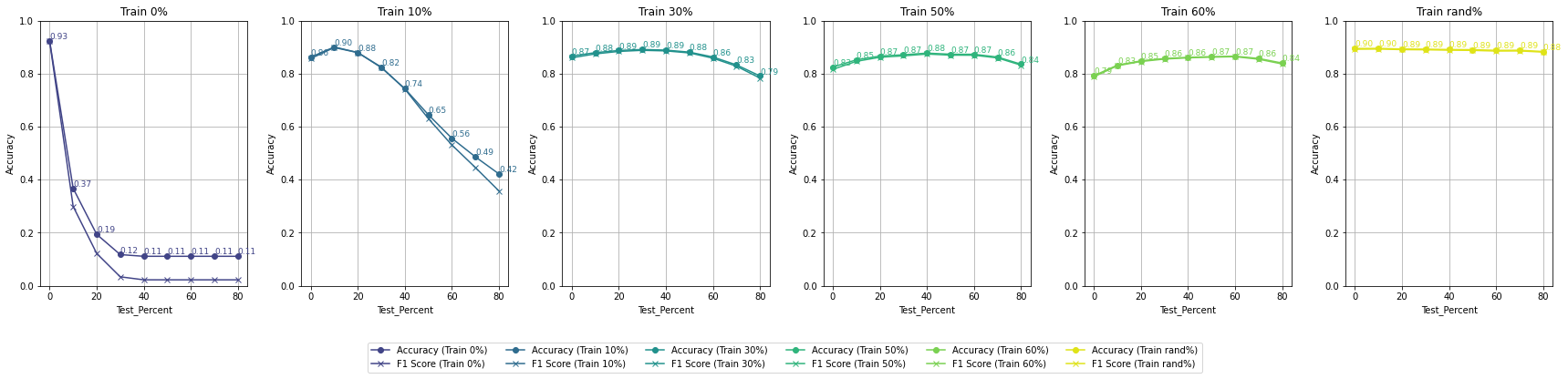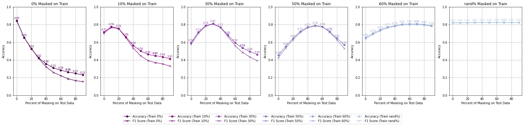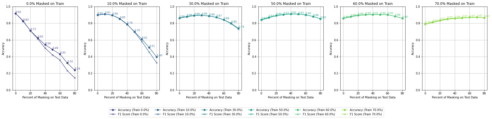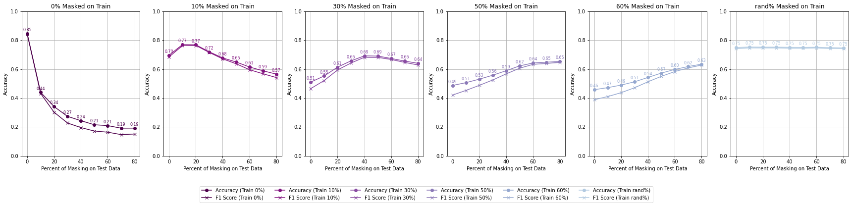Here are the accuracy and F1-Score results for each trained model evaluated by the range of percentages of masked pixels: