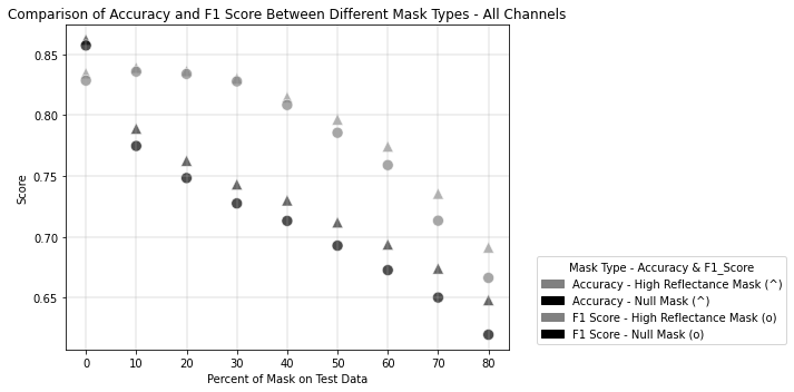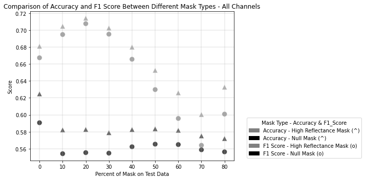 The results show that both masking strategies yield relatively high performance, with mean F1-scores and accuracies above 0.7 for both approaches. However, the High Reflectance Mask consistently outperforms the Null Mask: